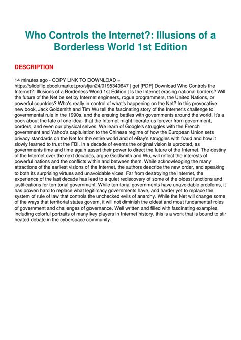 Download Who Controls the Internet Illusions of a Borderless World Epub By Click Button. Who Controls the Internet Illusions of a Borderless World it’s easy to recommend a new book category such as Novel, journal, comic, magazin, ect. You see it and you just know that the designer is also an author and understands the challenges involved with having a good book. You can easy klick for detailing book and you can read it online, even you can download it